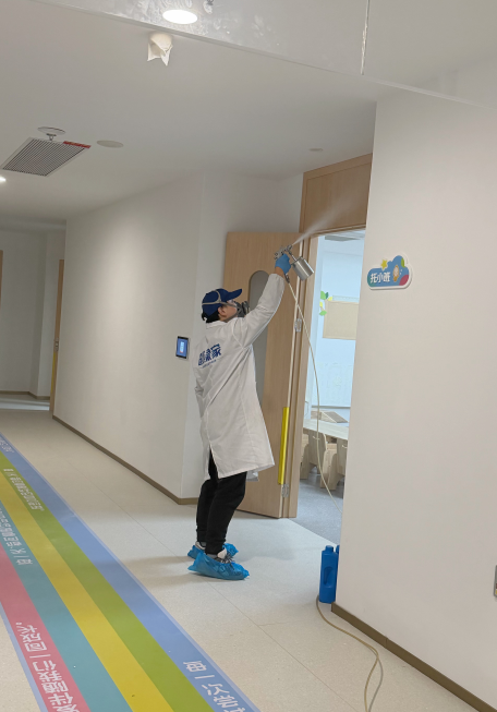 本次服務的托育園總面積 1400㎡,涵蓋多個教學活動室、幼兒睡眠區、公共游戲區及配套功能室,裝修后存在課桌椅、儲物柜、軟包教具、PVC 地墊、墻面涂料等多重甲醛釋放源,且因空間布局分散、兒童接觸場景多,對治理藥劑的安全性、施工的精細化要求遠高于普通場所。我們的團隊以《托育機構衛生評價基本標準》《室內空氣質量標準》為核心依據,參照比國標嚴苛 20% 的母嬰級治理要求,量身制定「精準勘測 - 分域治理 - 源頭分解 - 長效防護」的全流程除醛方案,全程遵循安全無刺激、施工無死角、效果可驗證的三大原則,確保治理后可快速投入使用。